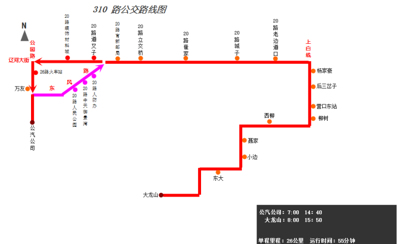 由公汽公司始發(fā),途經(jīng)公園路、建設(shè)街東風(fēng)路/遼河大街、遼河大街、營大路、上白線、營口東站路口、柳樹鎮(zhèn),終點到達大龍山